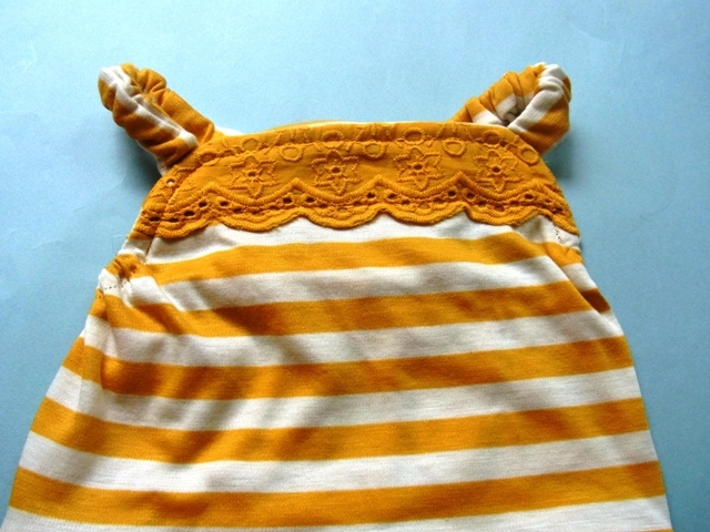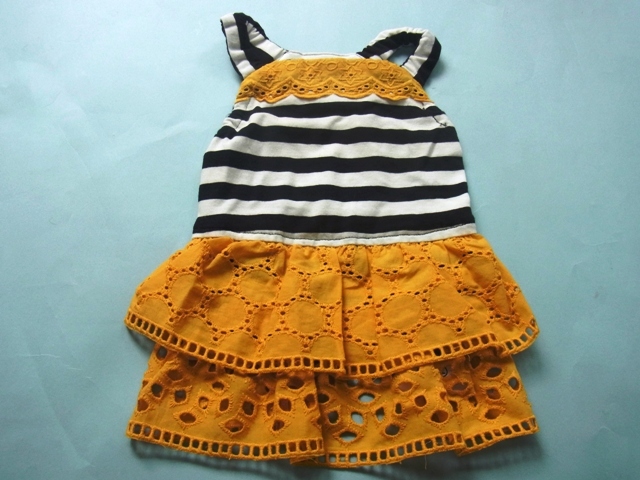 - 身頃は約1cm間隔の横ボーダー、スカート部分は2段のカットワークレースのギャザースカートワンピース。カットワークレースは柄が違う3種類を使用し豪華さを演出。