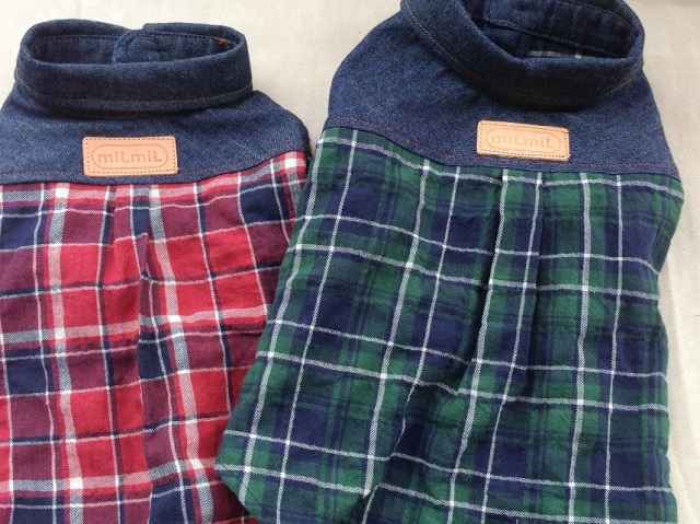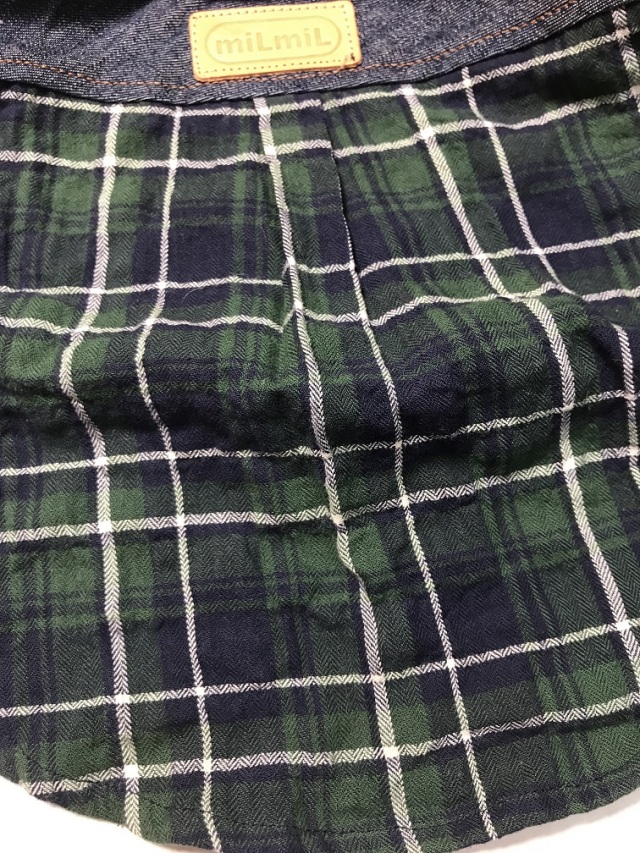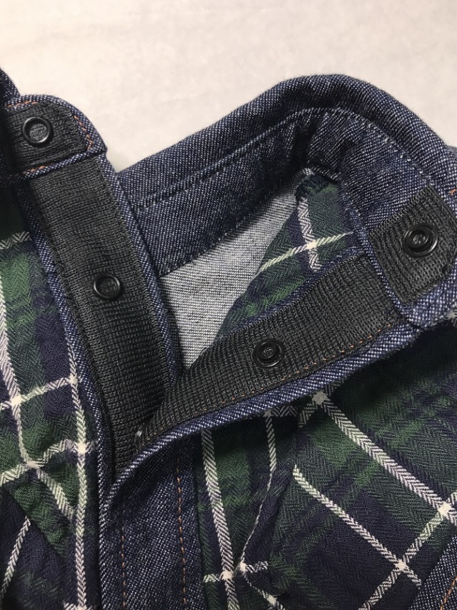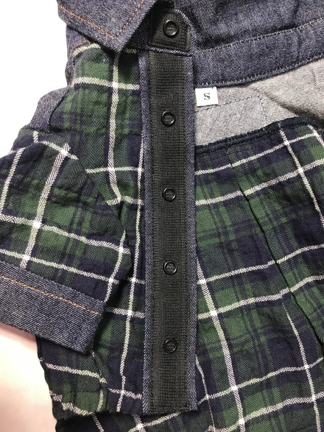 デニム素材とチェック柄のシンプルな台衿付きシャツです。前開きでスナップテープ仕様です。デザイン性と機能性にも優れた春~秋までお散歩に大活躍の商品です。後ヨーク切り替えでタックを後身頃に入れています。ステッチは茶色のカラーステッチでデザインポイントです。前身ごろはゴムを裾に入れています。素材はチェック、デニムとも伸びない生地です。